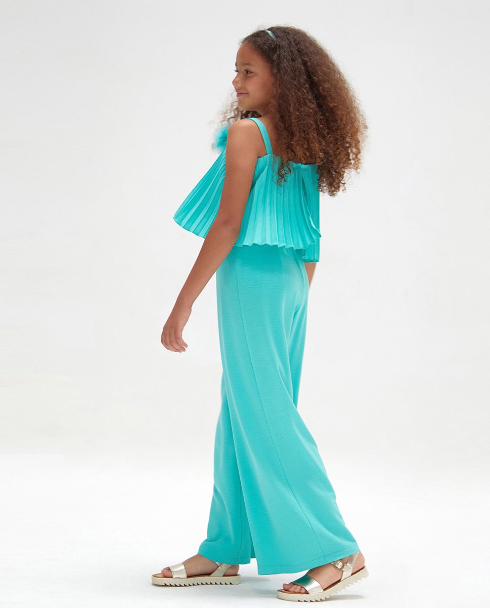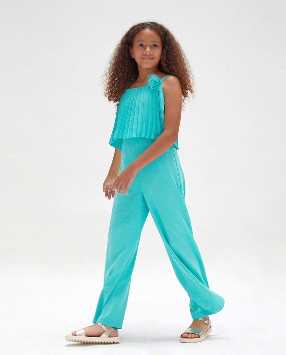 Espectacular y moderno mono largo para niña adolescente de la nueva colección de evento especial 2024 de la firma española Amaya, confeccioando en crepe de muy alta calidad de color coral con el pecho plisado.