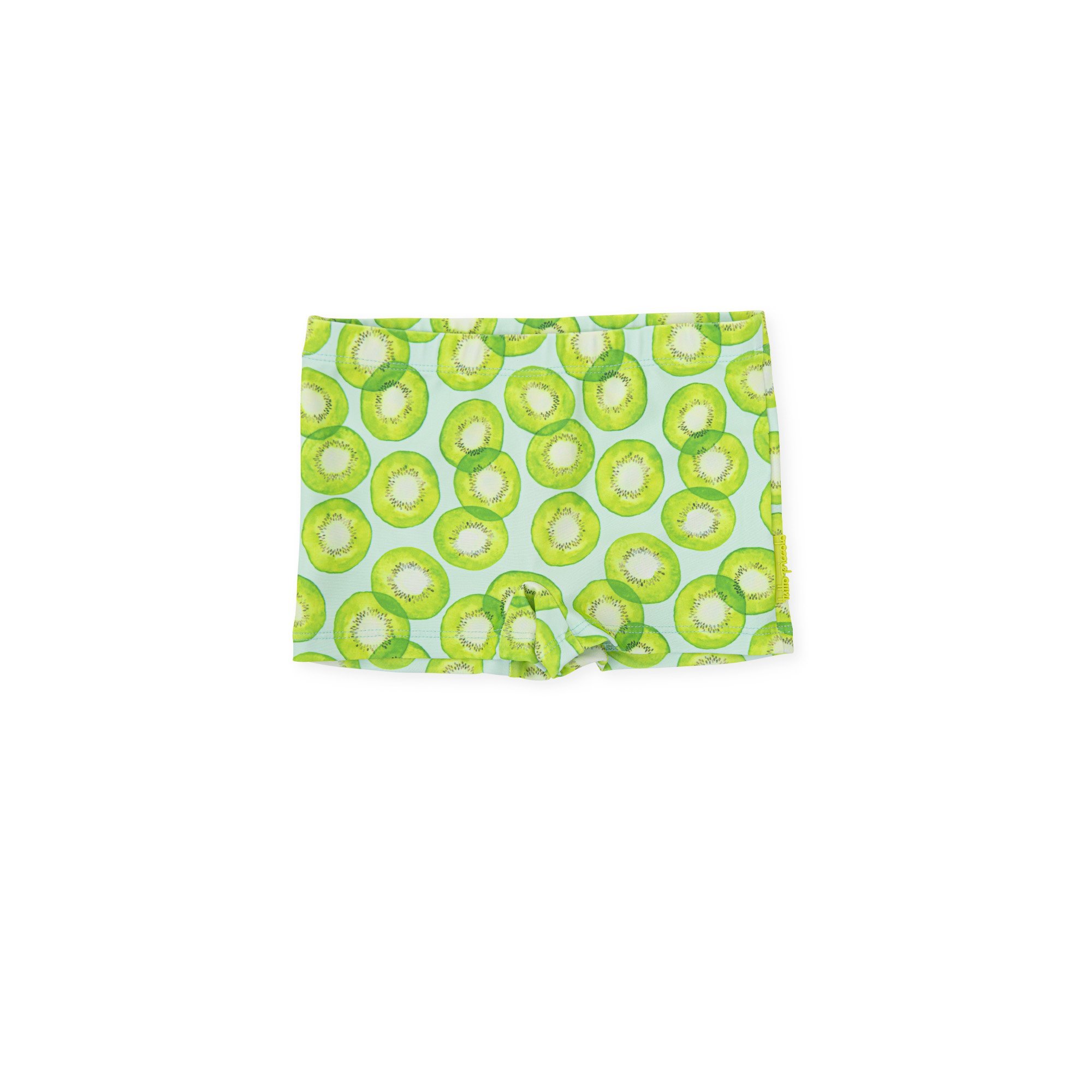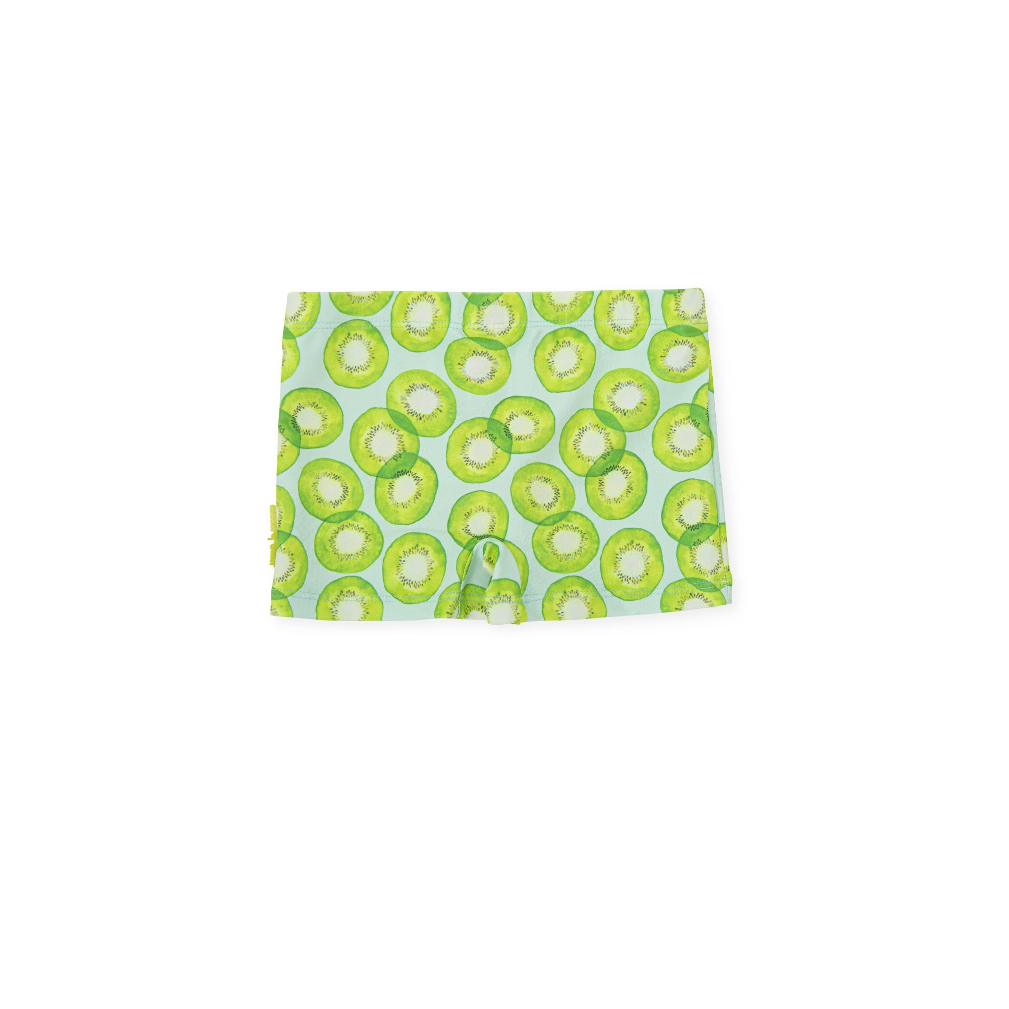 Traje de baño en tejido estampado con motivos de «kiwis» en un vibrante color lima.
