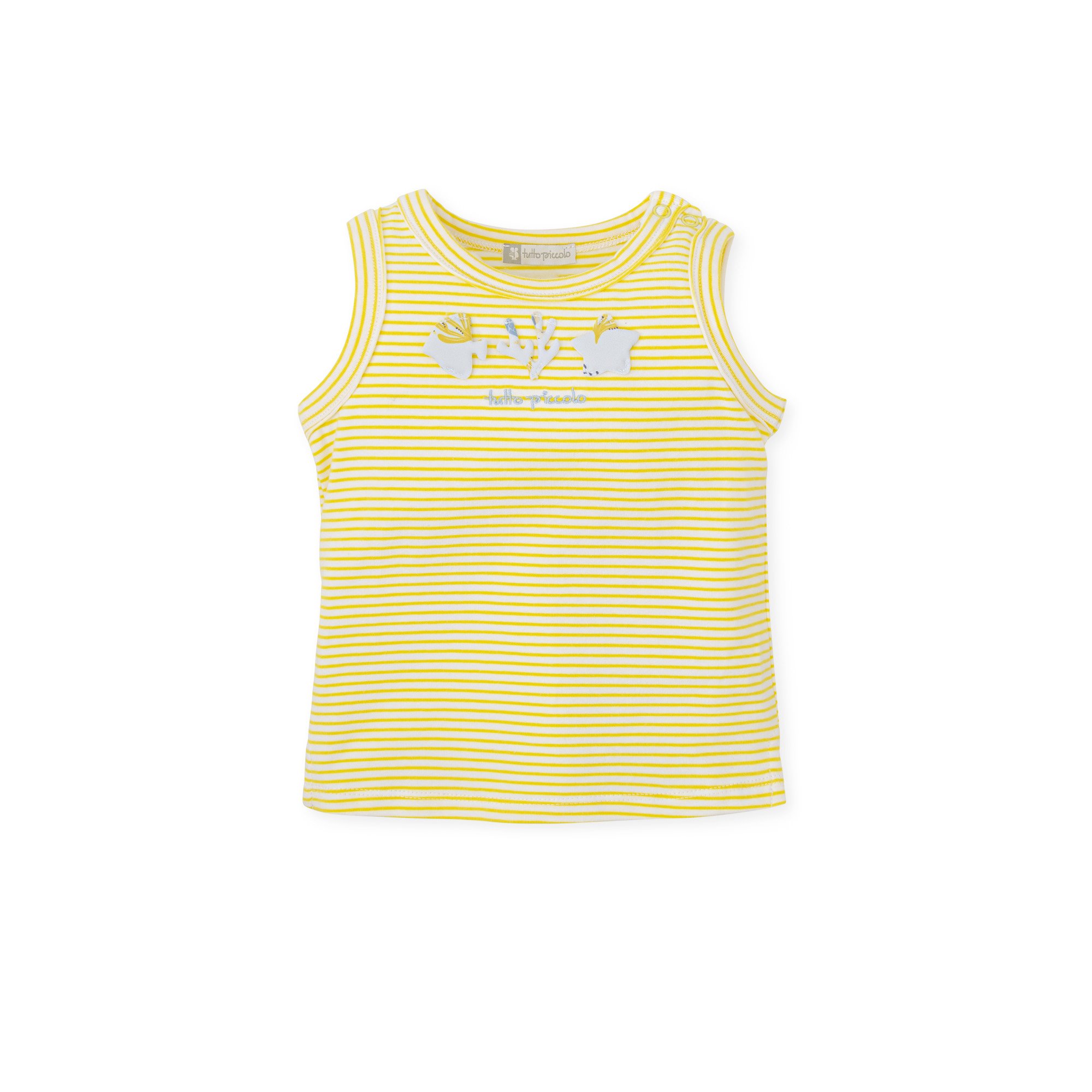 Camiseta sin mangas de punto liso en tono amarillo con rayas. Destaca por su detalle bordado y apliques de peces en foam. Presenta una elegante abertura en el hombro con botón a presión.