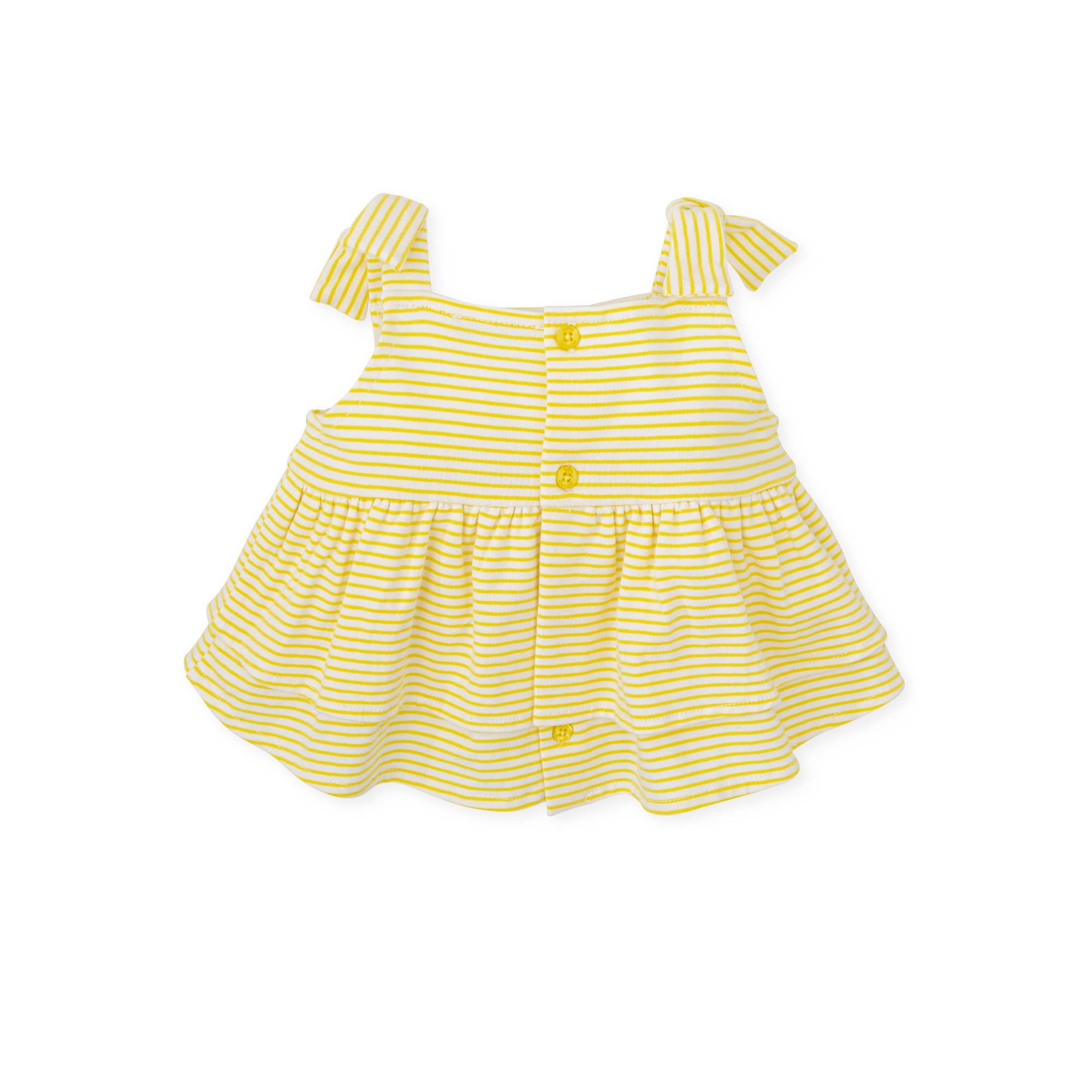 Top sin mangas en tejido liso de color amarillo, decorado con un encantador estampado de rayas. Destaca por su detalle de bordado y aplicación de foam en la parte delantera. Presenta una elegante abertura trasera con botones.