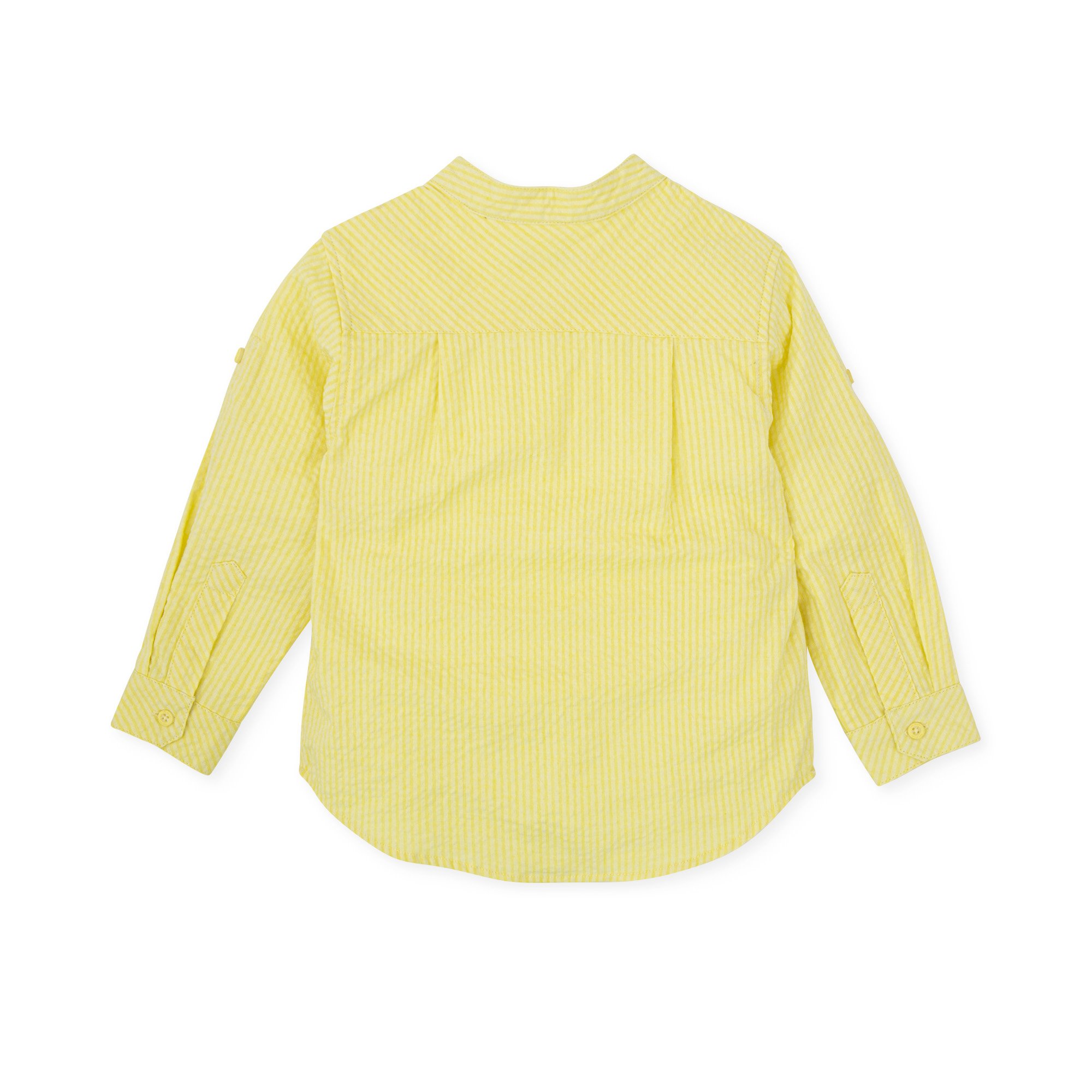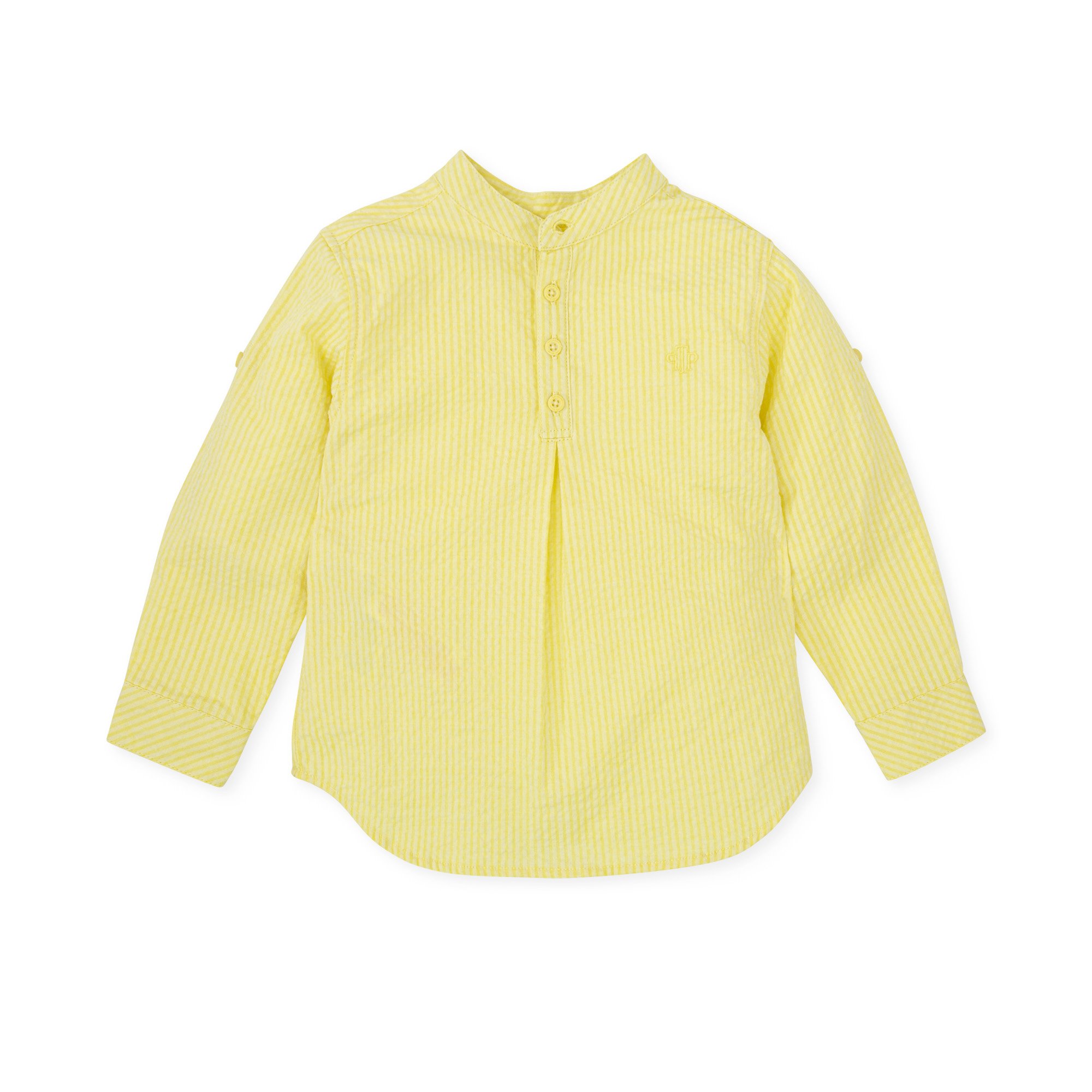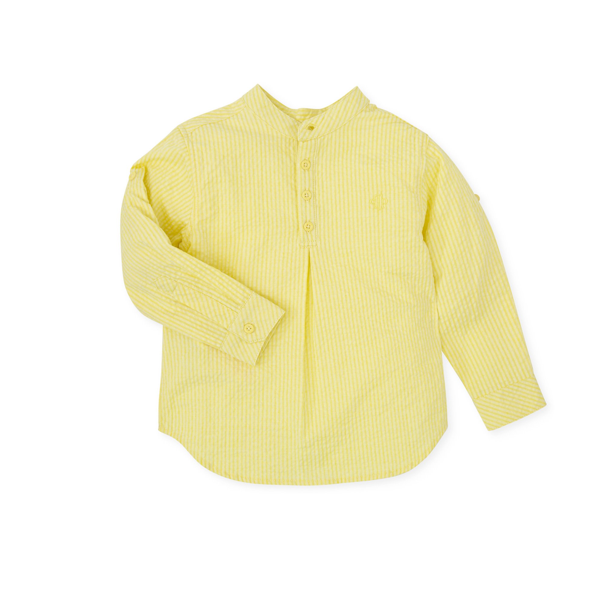 Camisa manga larga de tejido seersucker con abertura delantera con botones, cuello mao y bordado logo.Trabilla para recoger la manga