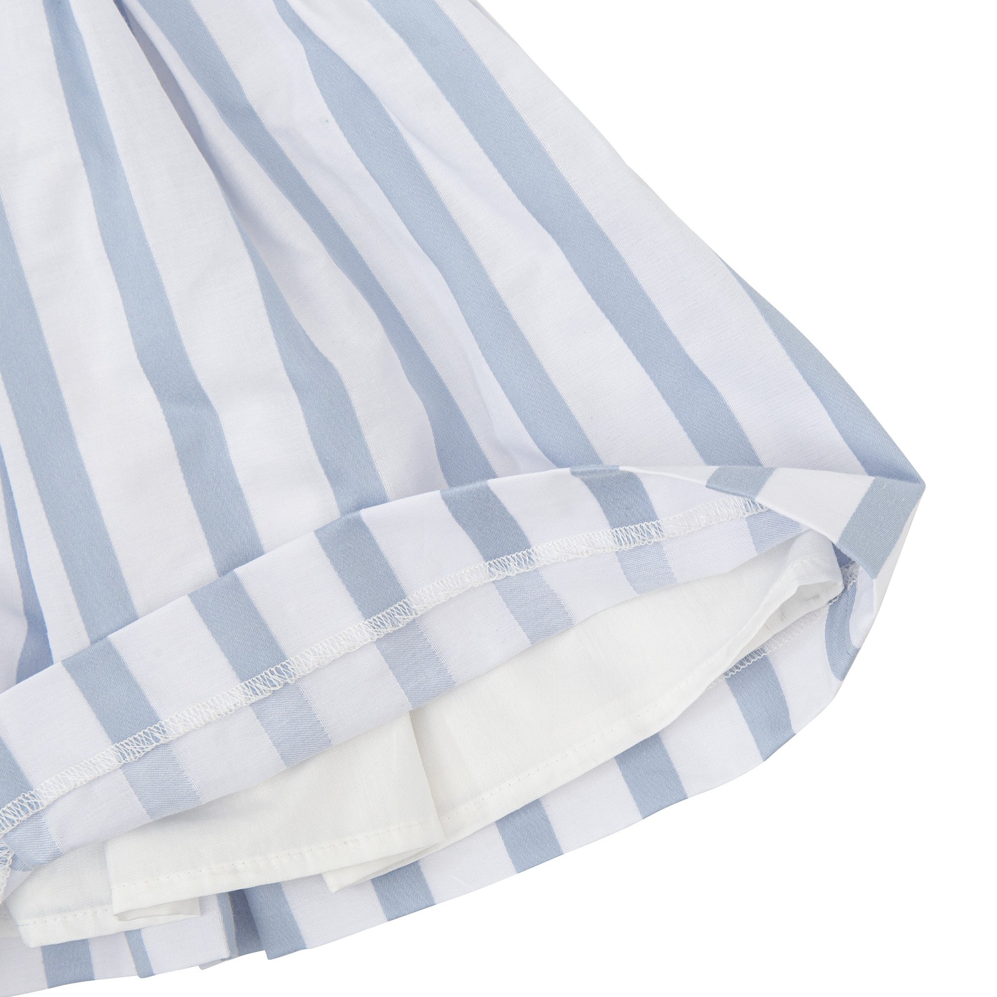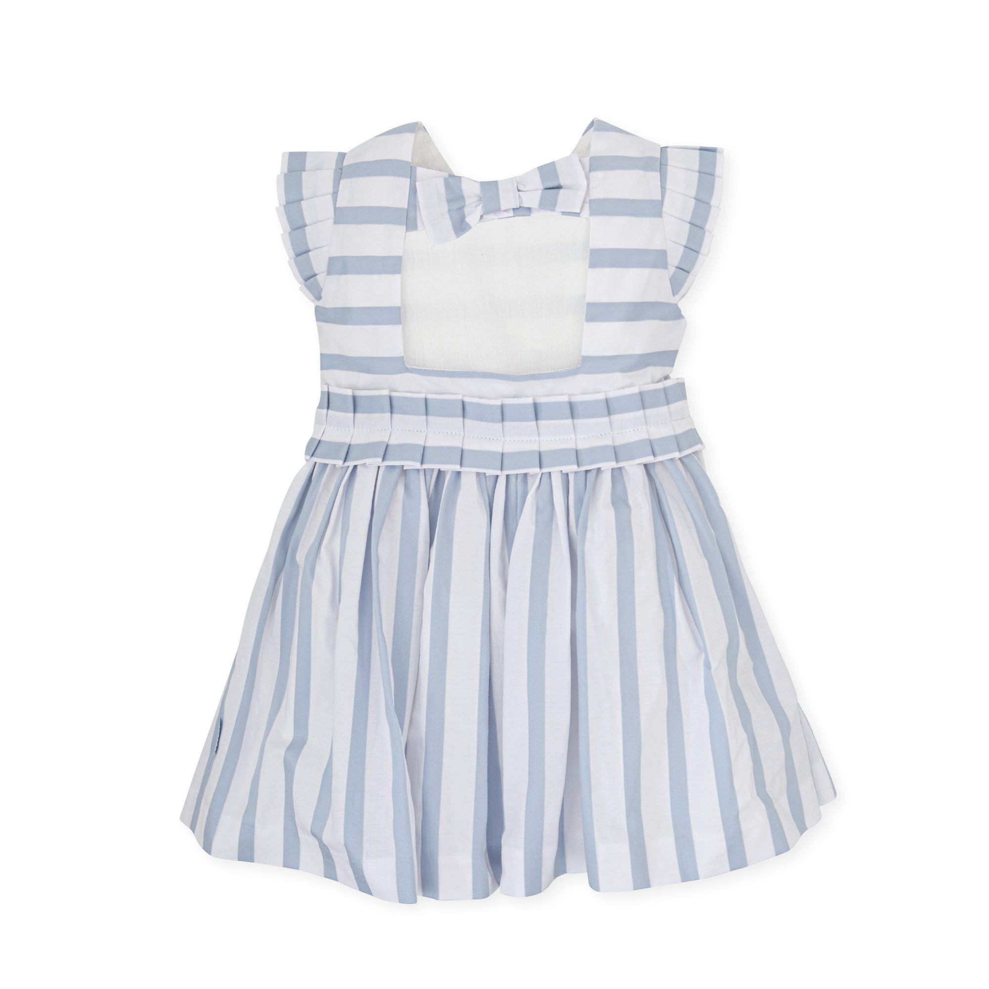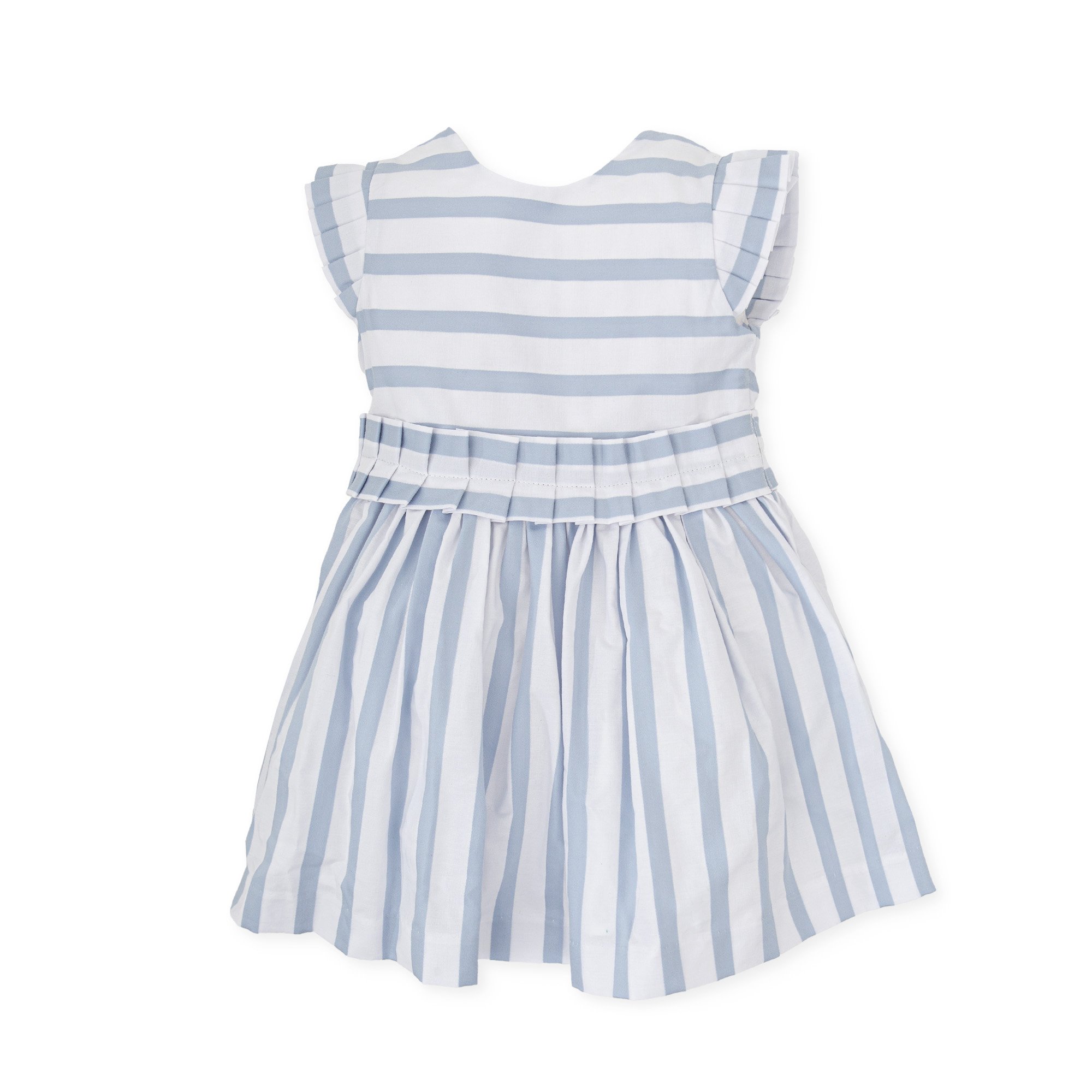 Vestido manga corta de tejido rayas blanco y porcelana con suave enagua. Detalle mangas y cinturón plisado y lazo en espalda. Abertura lateral con cremallera.