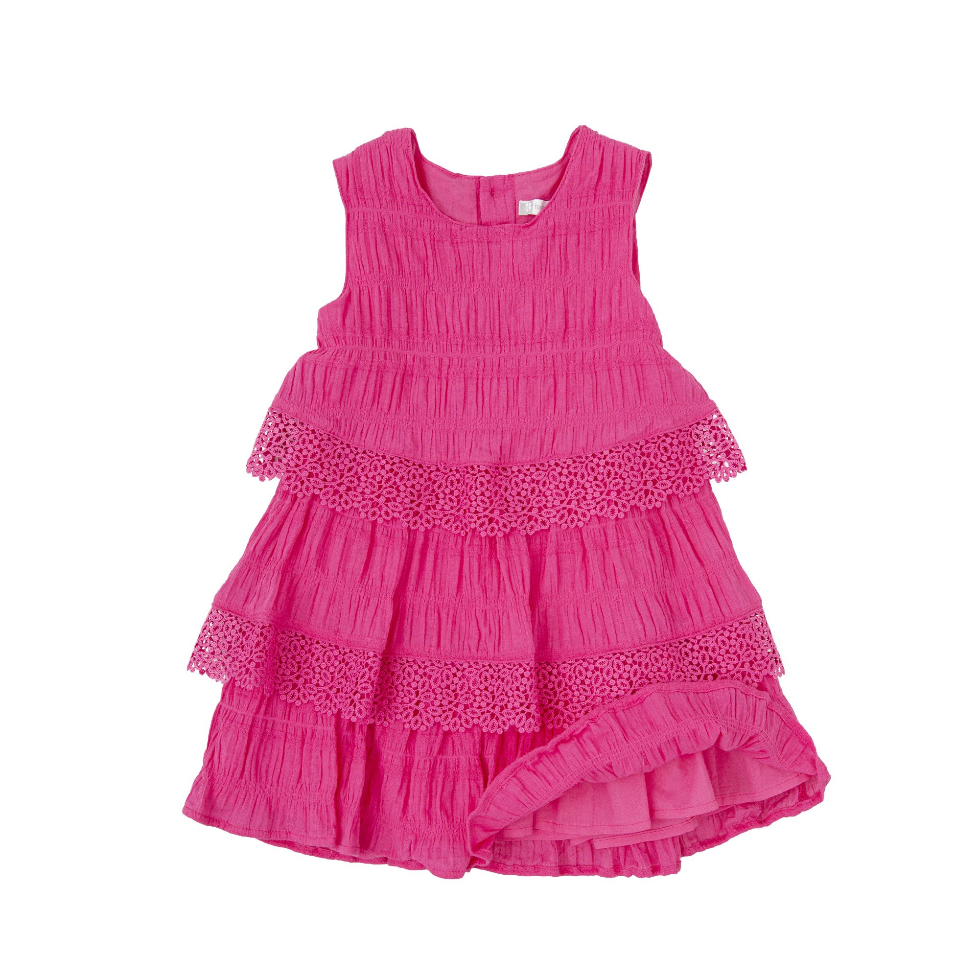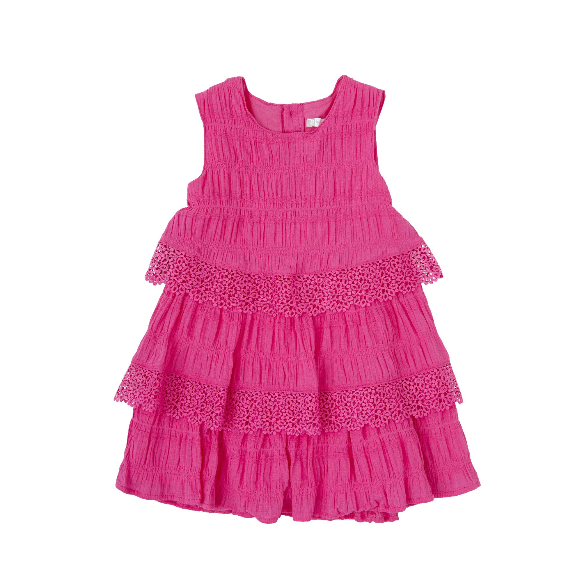 Vestido s-m de bambula fucsia con suave forro. Volantes acabados con puntilla a tono. Abertura trasera con botones.