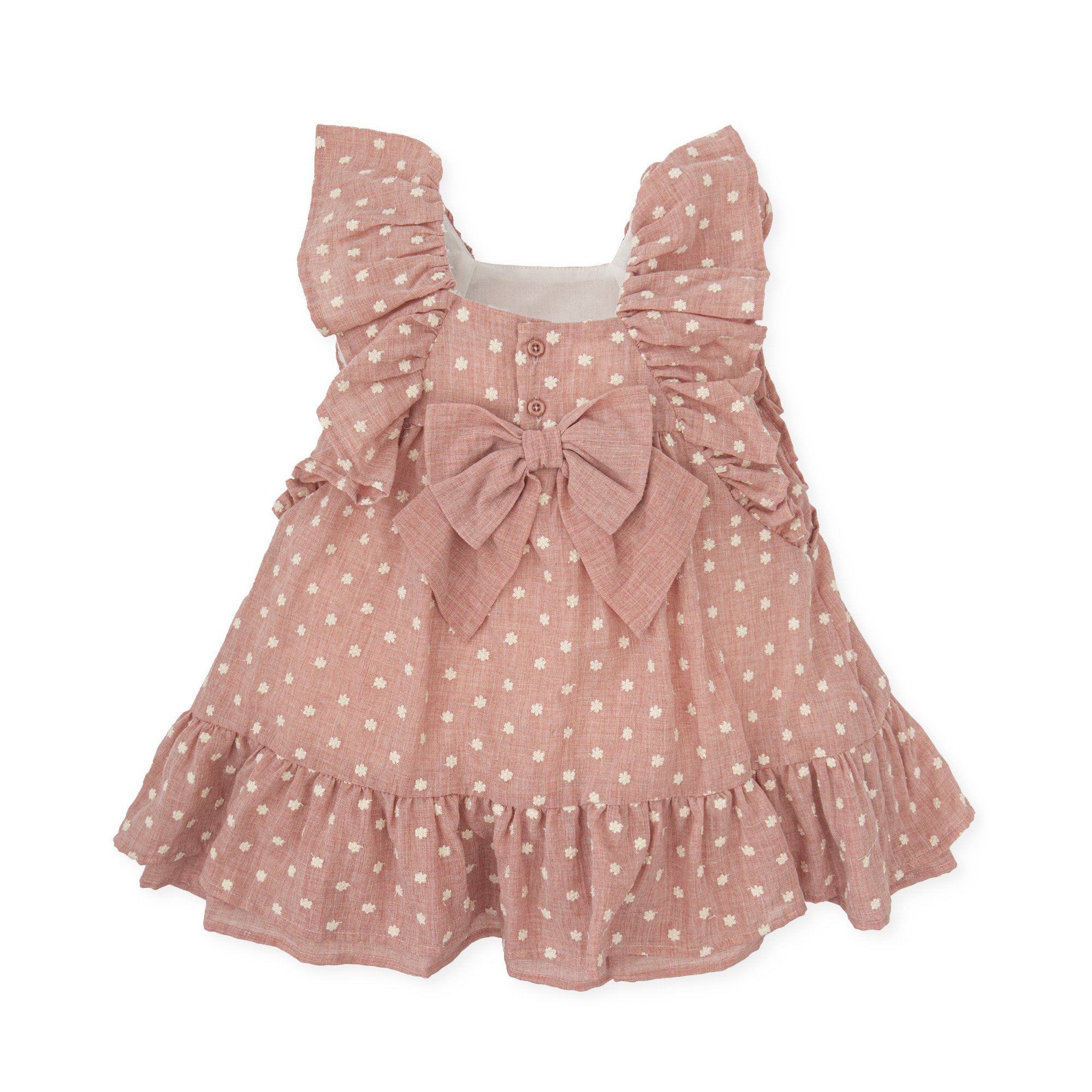 Vestido de muselina bordada flores combinada con muselina lisa y suave forro. Volantes en mangas y bajo. Detalle lazo en el trasero. Abertura trasera con botones.