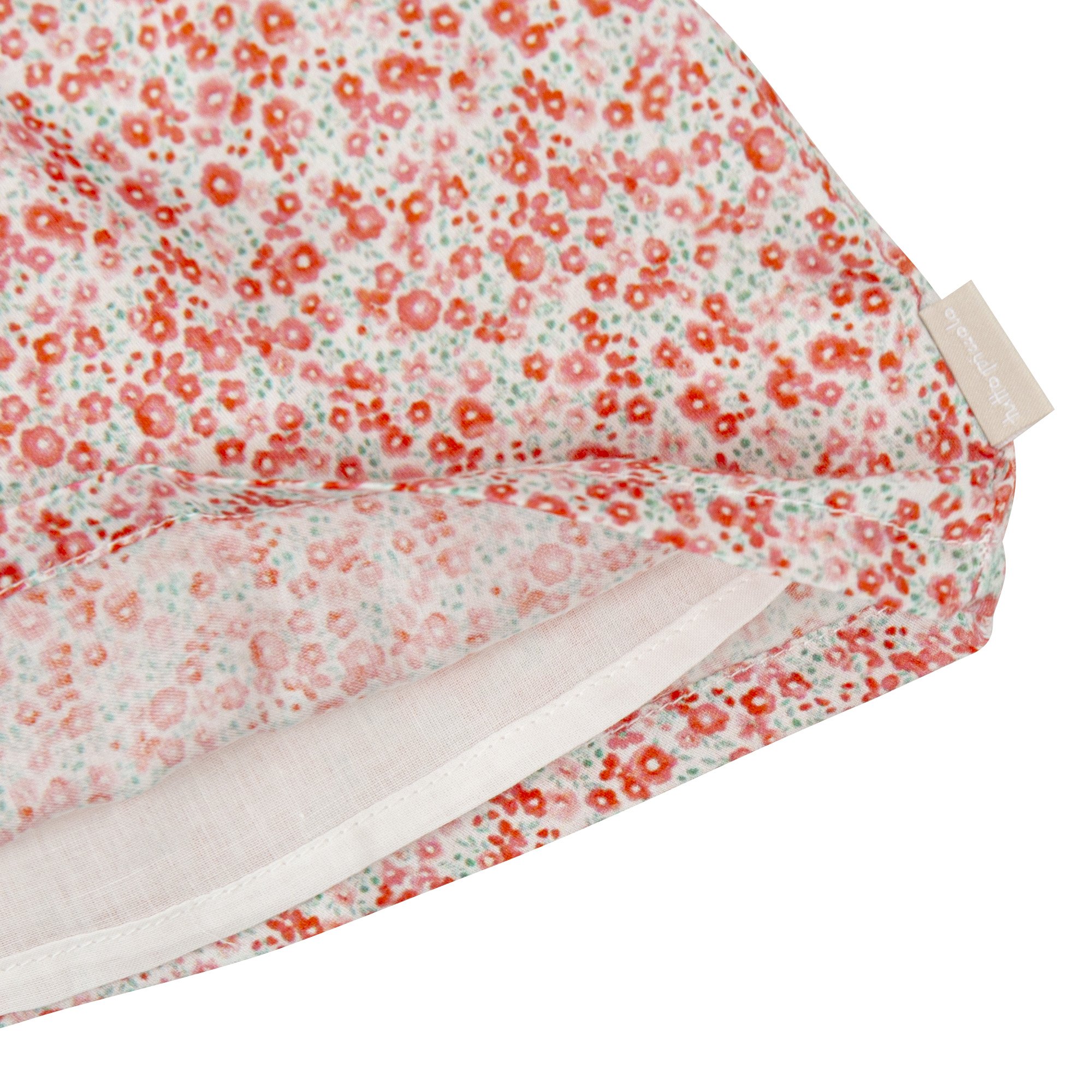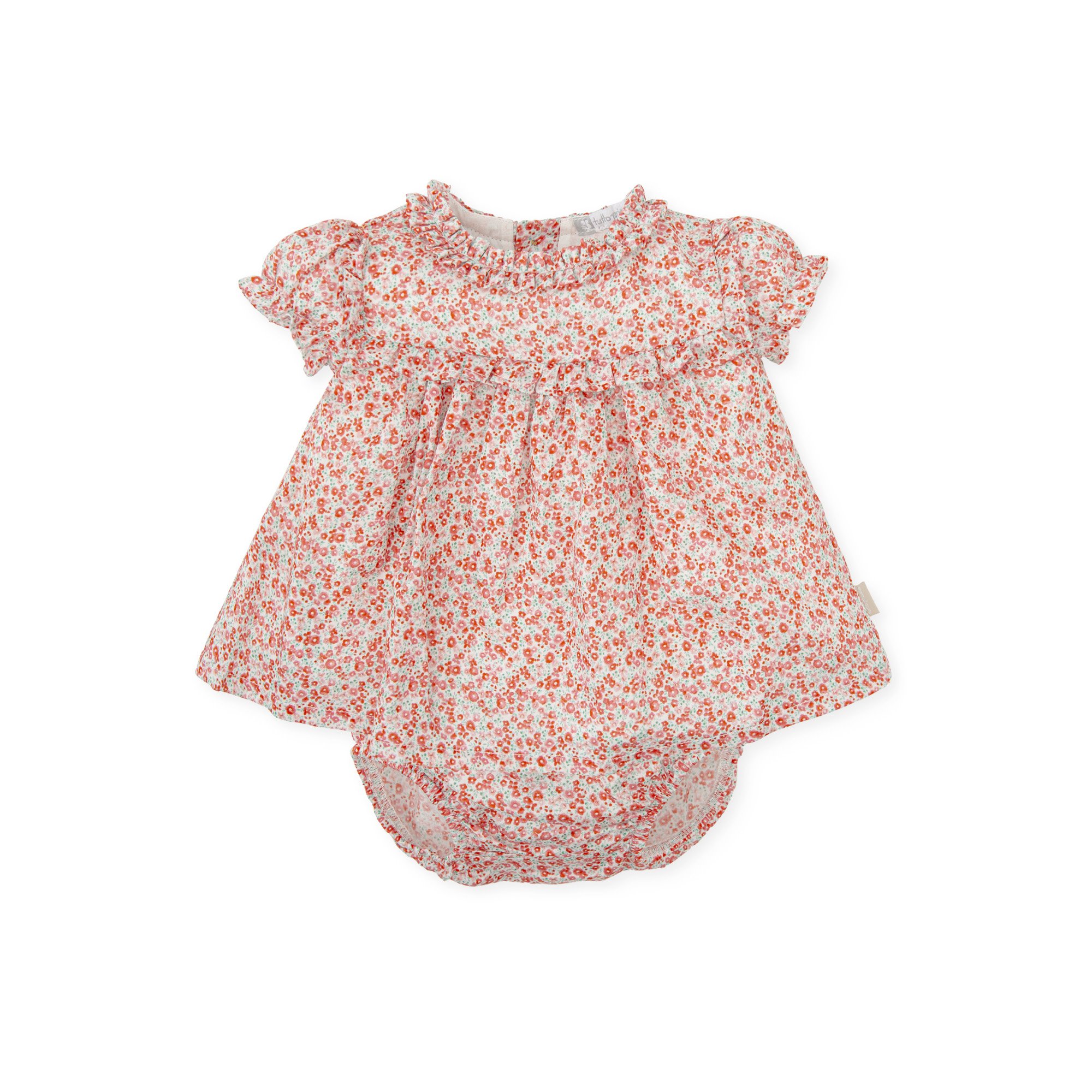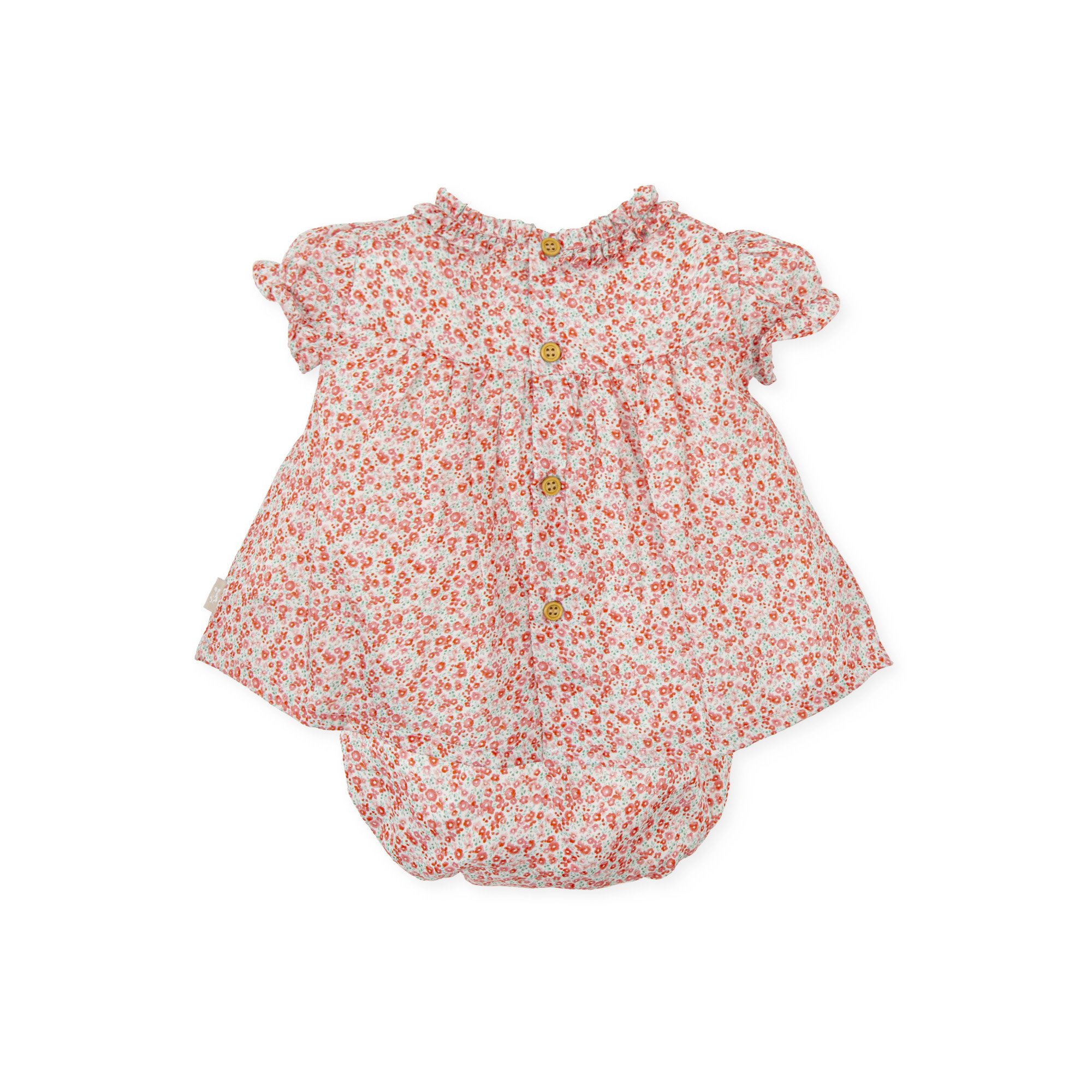 Vestido con braguita de satén estampado de florecitas, con un suave forro para mayor comodidad. Destaca por su detalle de volante en el delantero y suave elástico en las mangas. Además, cuenta con una abertura trasera con botones. La braguita, también de satén, tiene un suave elástico en la cintura y los muslos para un ajuste cómodo.